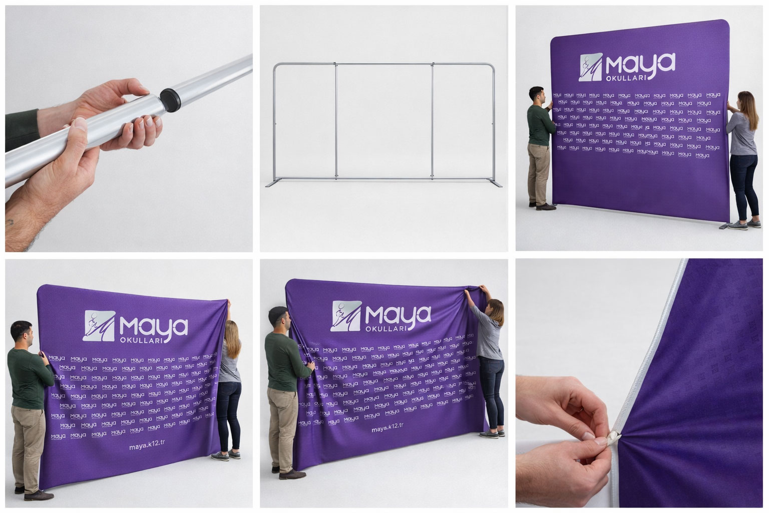 25mm alüminyum profilin modüler yapısı 300 cm genişliği parçalara bölerek taşımayı kolaylaştırır. Likralı kumaş ise 230 cm yükseklikte bile kırışıksız ve tam gergin bir görünüm sağlar.