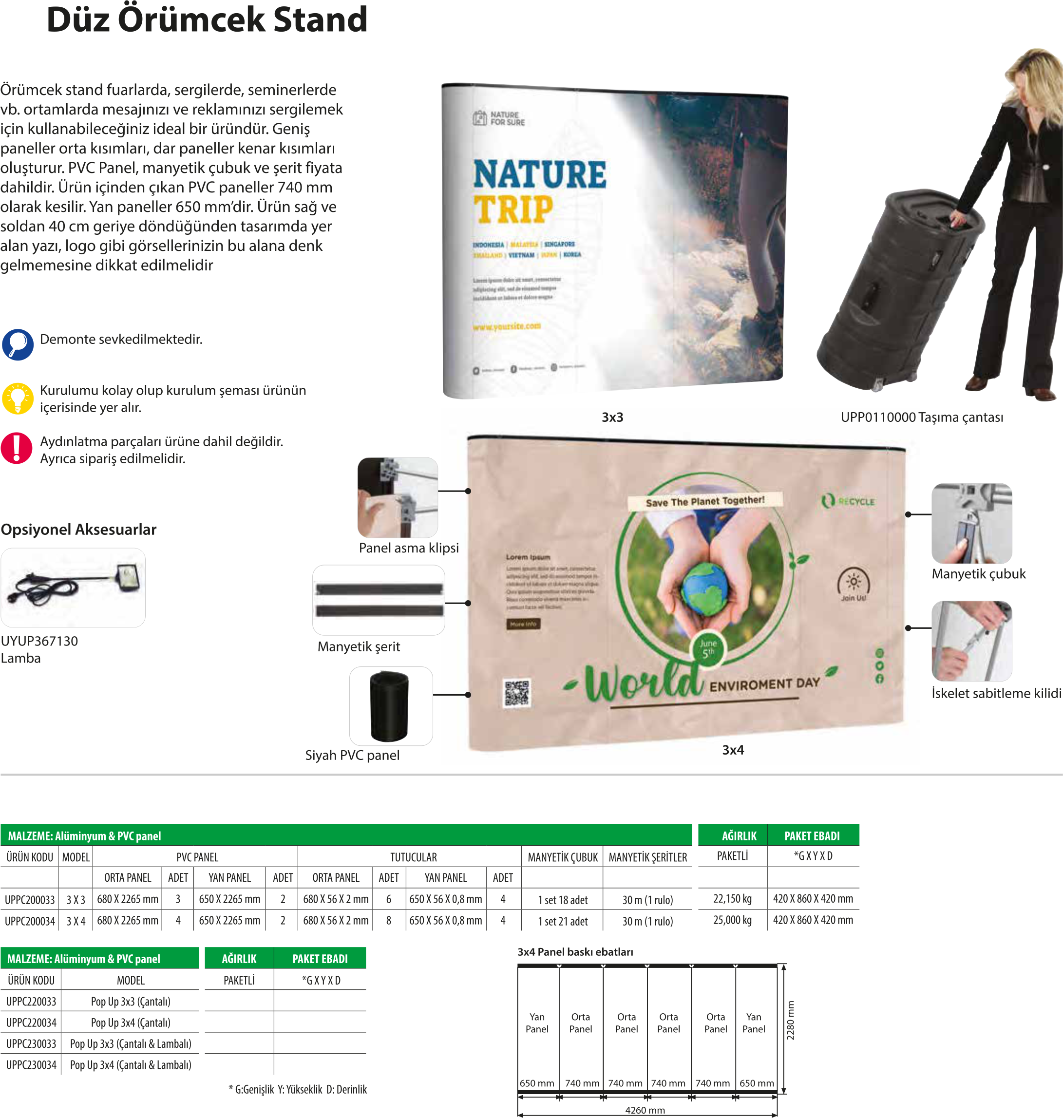 Düz örümcek stand, fuarlarda, sergilerde, seminerlerde ve benzeri ortamlarda mesajınızı ve reklamınızı sergilemek için kullanabileceğiniz ideal bir üründür. 3x4 modeli, 3x3'e kıyasla ekstra bir orta panel ve daha büyük paket boyutuyla daha geniş bir yüzey sunar; standart 3x4 m fuar kabinlerine tam oturur.