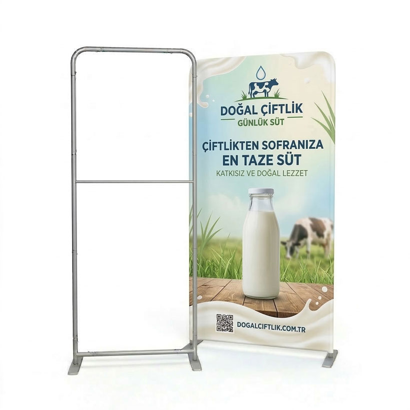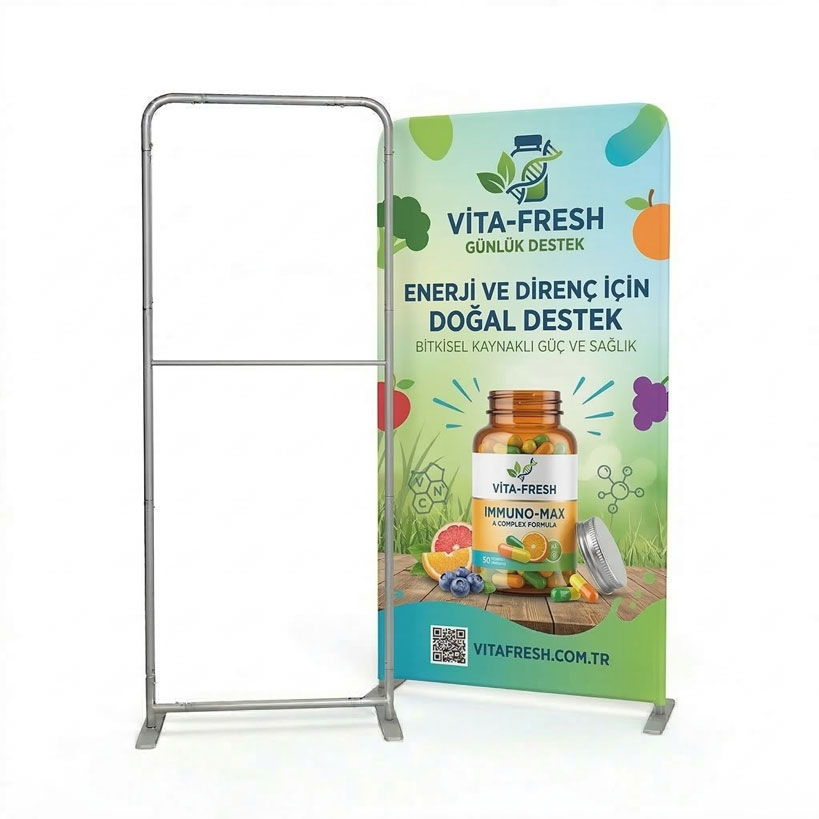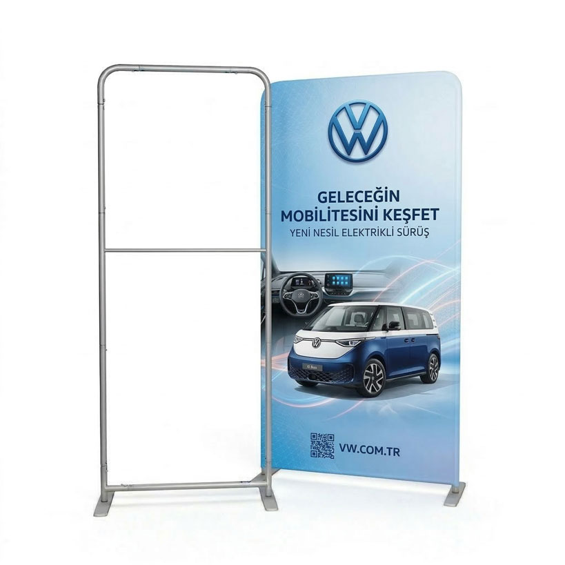 Fuarlar, mağazalar, oteller ve kurumsal etkinliklerde marka görünürlüğünü artırmak için tasarlanan fabric display stand, klasik roll-up ve PVC panel standlara modern bir alternatif sunar. 85x200 cm boyutları; tek kişilik sergileme noktaları, ürün tanıtım köşeleri ve fuar girişleri için biçilmiş kaftandır.